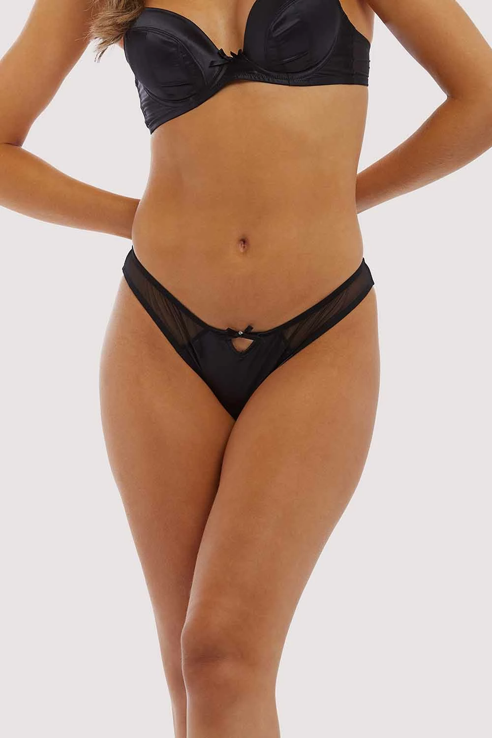 Feel sensational in our Sophia Black Brazilian Brief. These briefs are constructed from smooth black satin and sheer mesh, it also features a key hole detail with a bow in the centre. Match with our Sophia Bra for the complete classy co-ord.