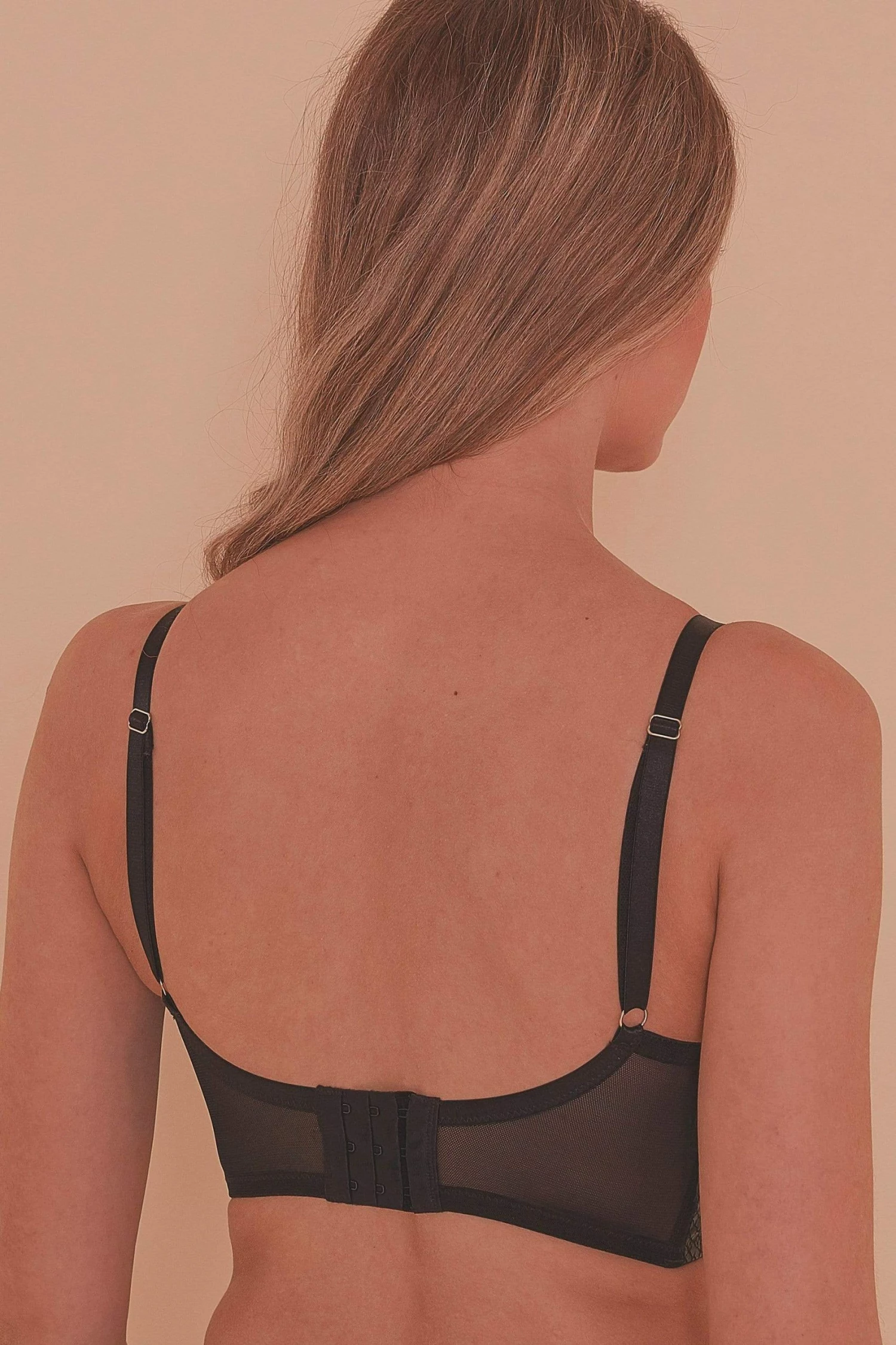 Exude sex-kitten attitude in our drop-dead seductive Aerona. The bra features thicker padding for greater support and more pronounced va-va-voom curves, and is covered in head-turning faux-crocodile print leatherette fabric. The cups are trimmed by a deep layer of lush floral lace, and the band and the straps feature sexy fetish-inspired strappy details. Aerona has stronger mesh at the back for greater support and fastens with a series of hooks and eyes at the back.