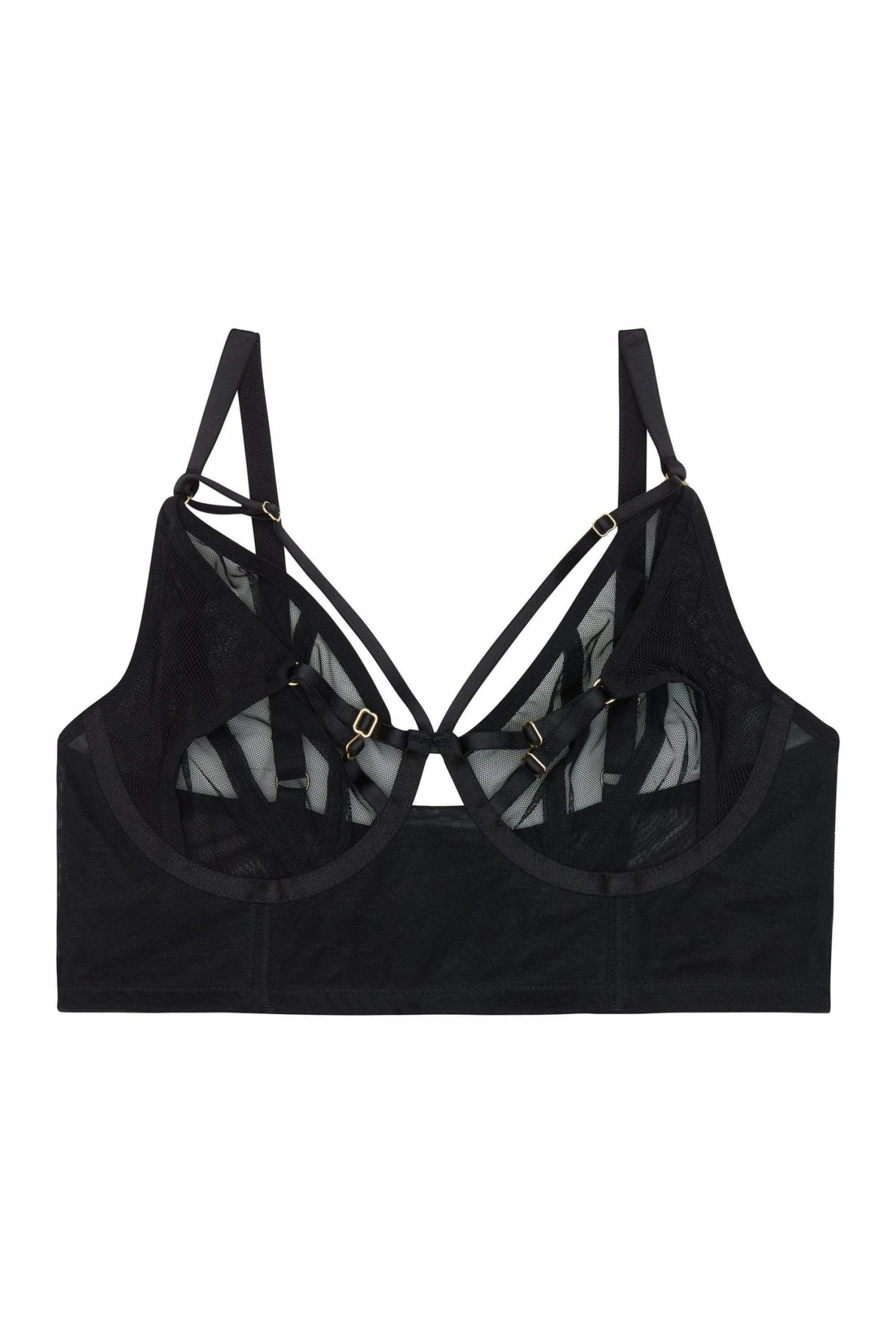 This ultra-strappy number is bound to get hearts racing! Featuring classic black mesh with fishnet panels, and satin elastic harness detail. Each strap is adjustable to get you the perfect look.