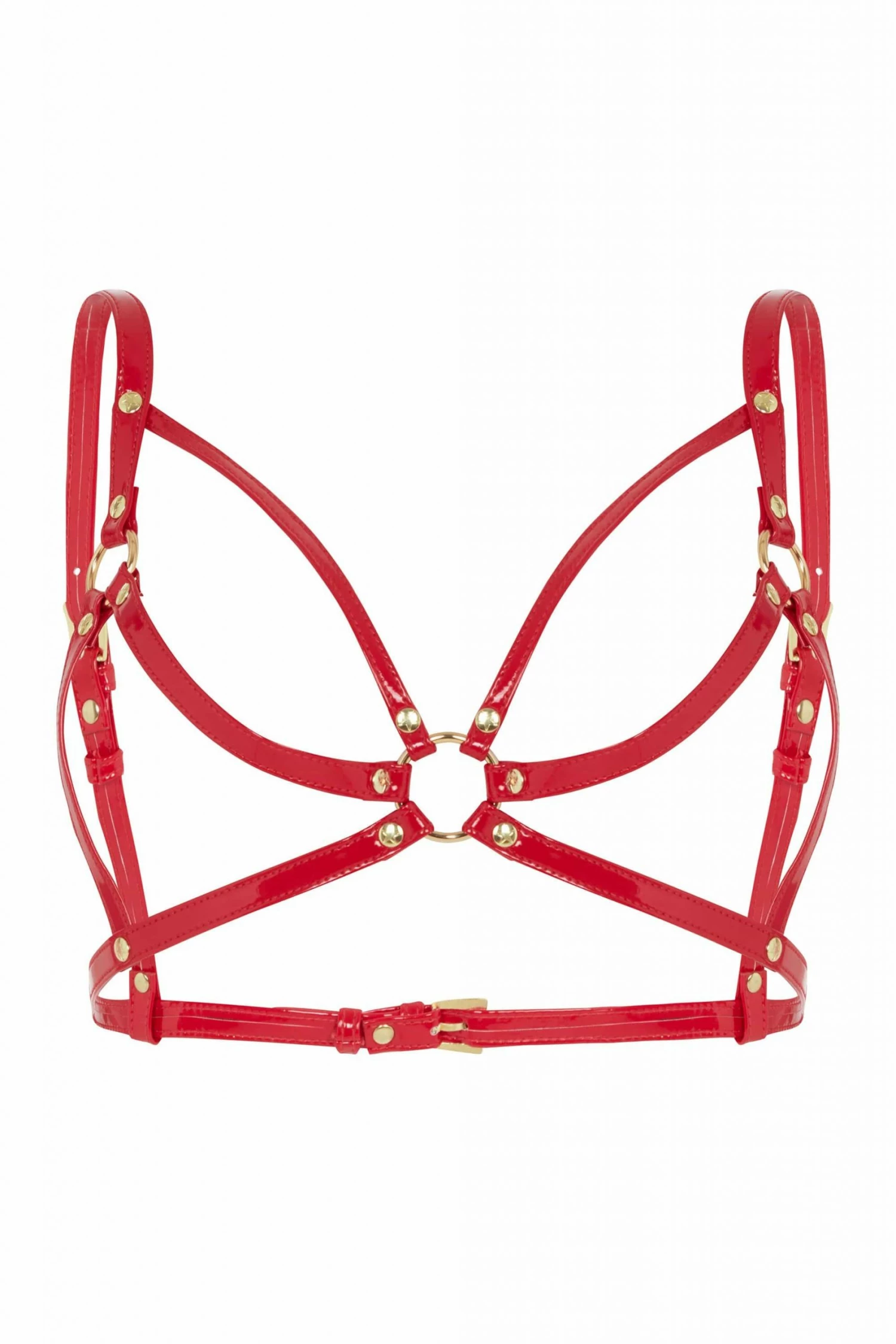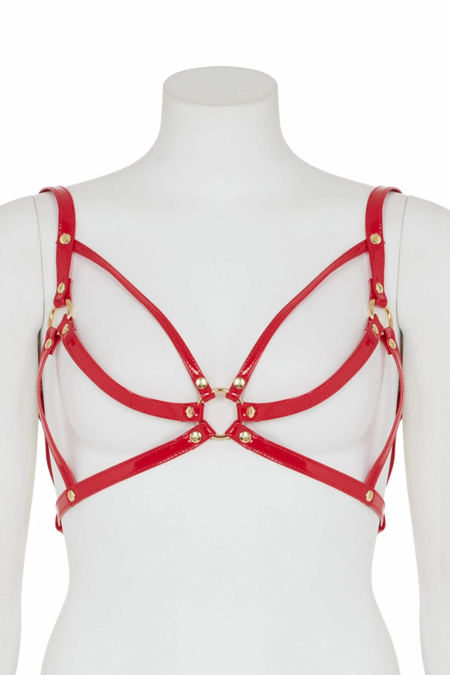 An open cup style harness bra that can be worn over anything looks stunning in this bright lipstick red.