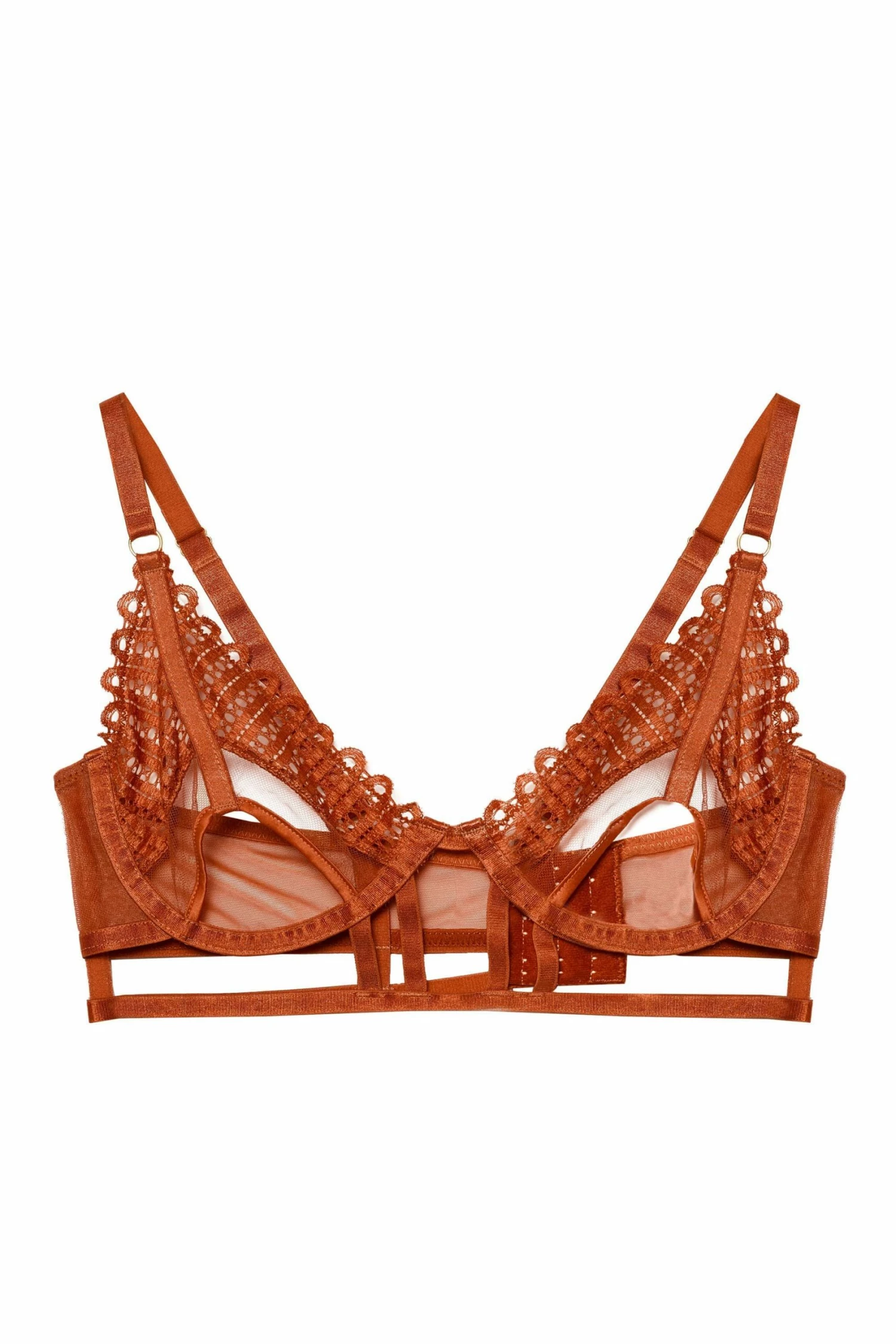 Turn up the heat in our Ellie Rust Open Bra. It is constructed from rust mesh and intricate lace and strappy caging detailing throughout. The open cut-out detail on the cups adds a little oomph to this pretty lace bra. Match with our Ellie Rust Suspender and Brief for the full look.