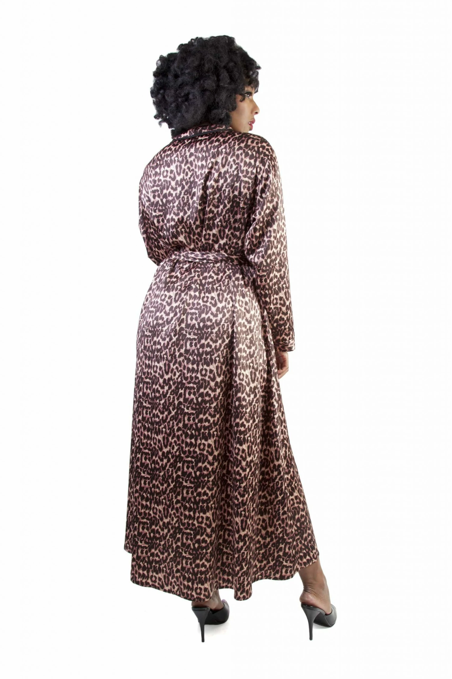 This Leopard Print Satin Robe is frisky pin-up glamour personified! The floaty satin full length robe is the perfect lounging piece for all those vintage vixens and retro sirens out there. The robe features playful leopard print, black piping along the lapel, a straight cut for extra luxuriant swishy volume, and fastens with a matching satin leopard print tie.