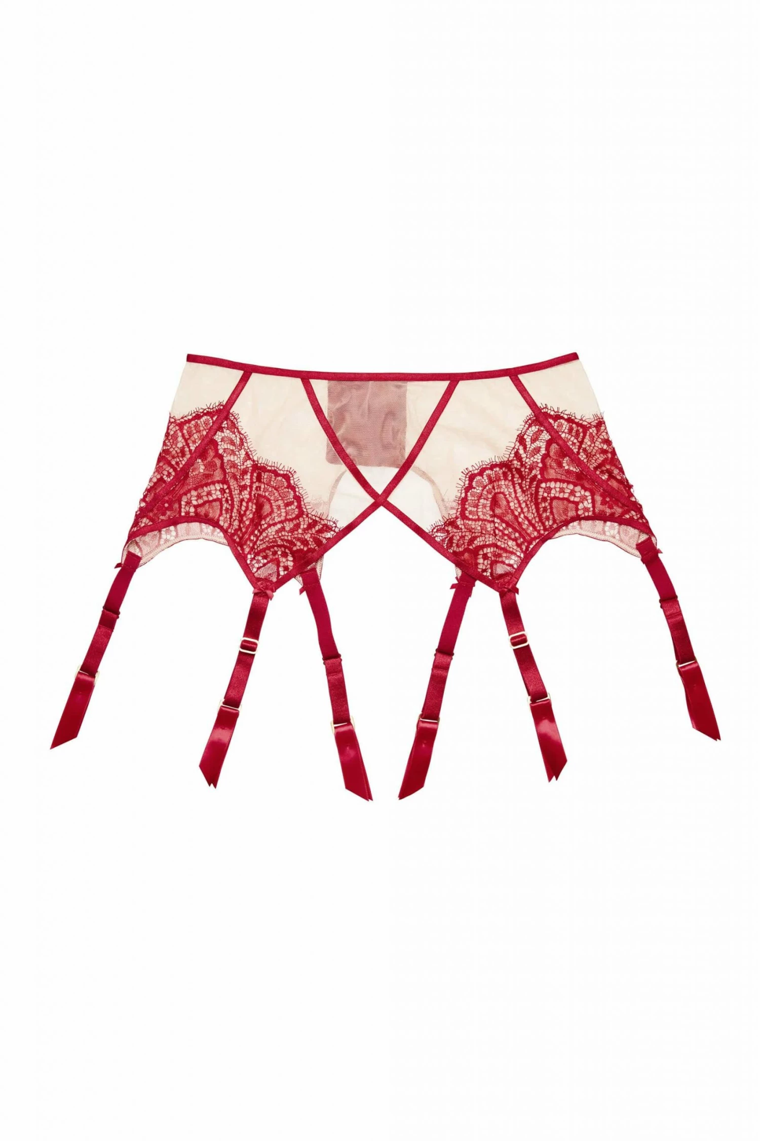 The suspender is vintage inspired with a wide front panel which features lavish use of the Leavers lace over superfine light peach mesh and strap details across the front. The suspender has 6 garter attachments to ensure the stockings are always sitting secure and stable.