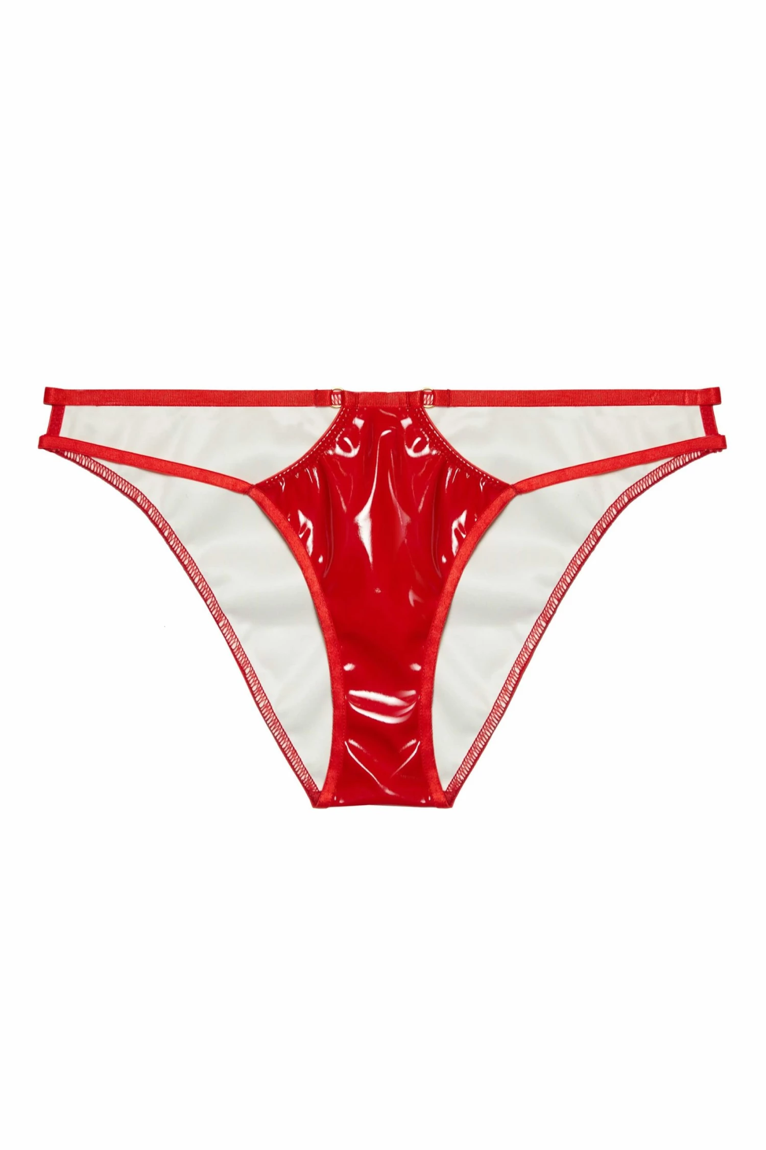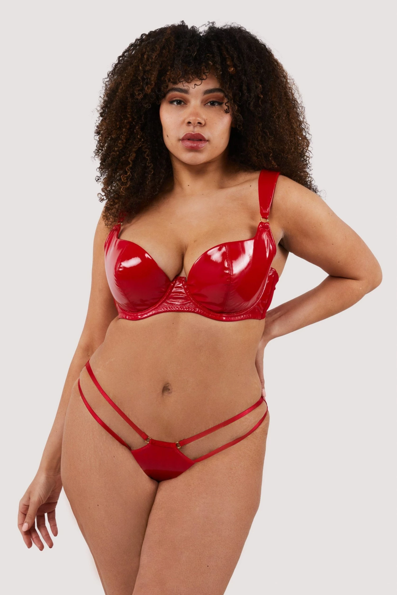 Hustler Lingerie X Playful Promises is an exciting new line of provocative and seductive lingerie for women who aren’t afraid to flaunt their sexuality. Maxine is fulfilling your S&M fantasy! This PVC set is molded to show off your body. The brief is strappy and features cut-outs, as well as a red PVC back
