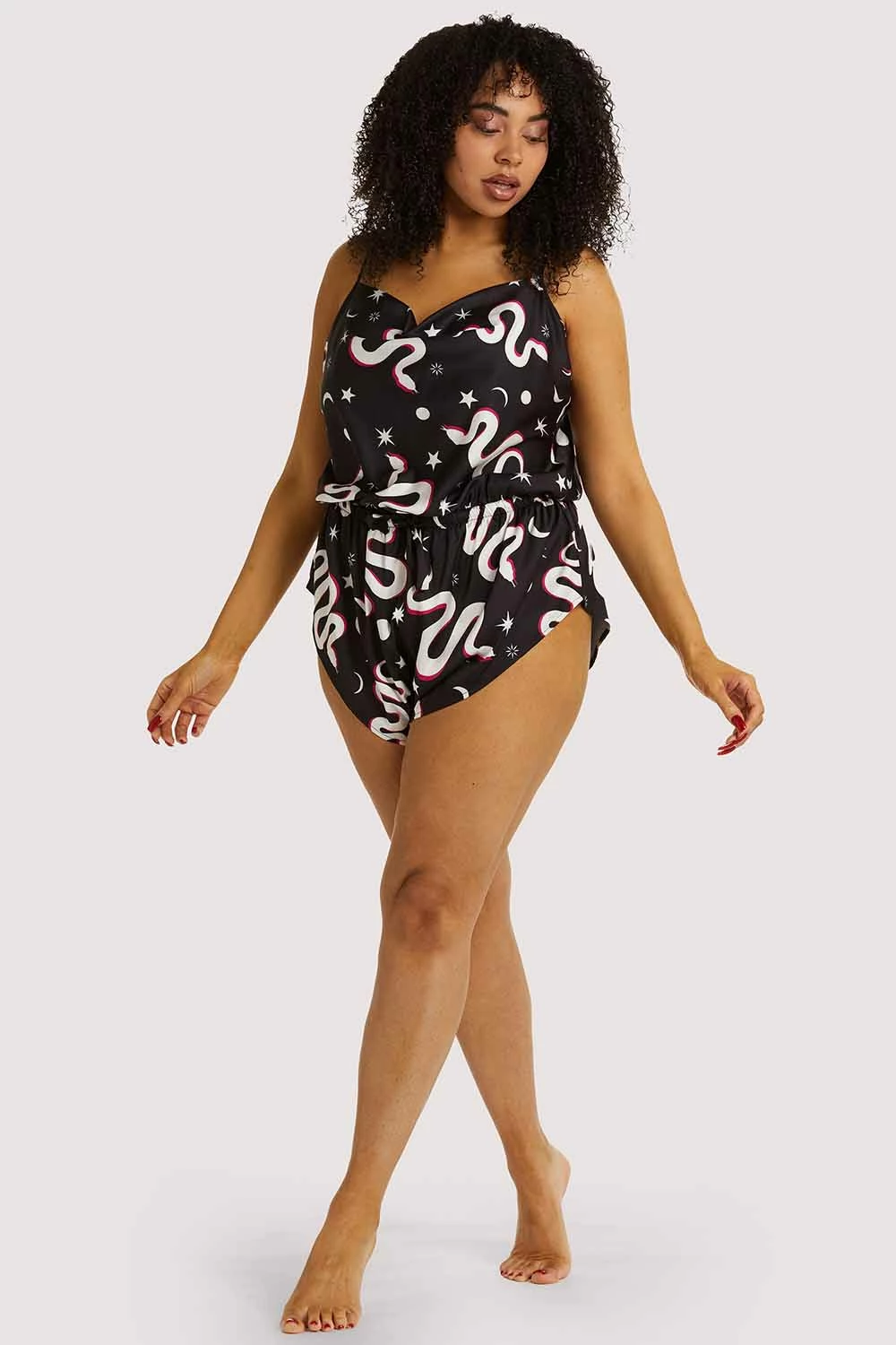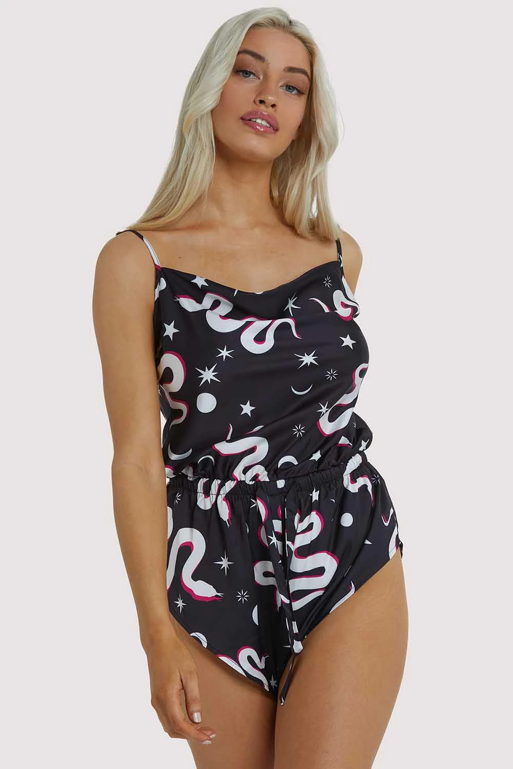 This sleep playsuit has a retro-inspired silhouette with a cheeky fit and a drawstring tie to cinch in at the natural waist. Cowl neck detail and adjustable straps with gold hardware. Digitally printed