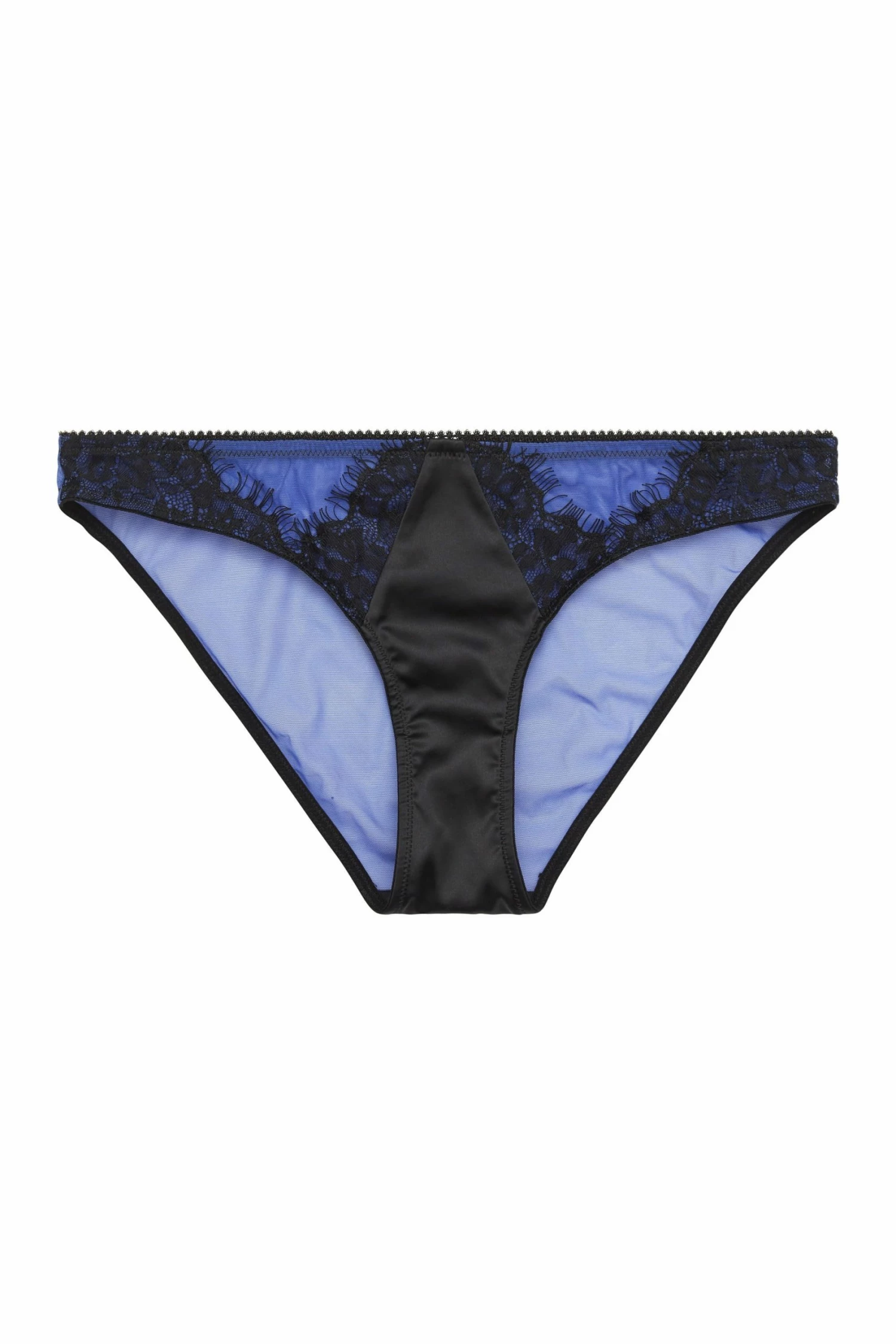Indigo is the perfect lingerie-drawer staple! Sheer indigo blue mesh is overlain with black fan lace.