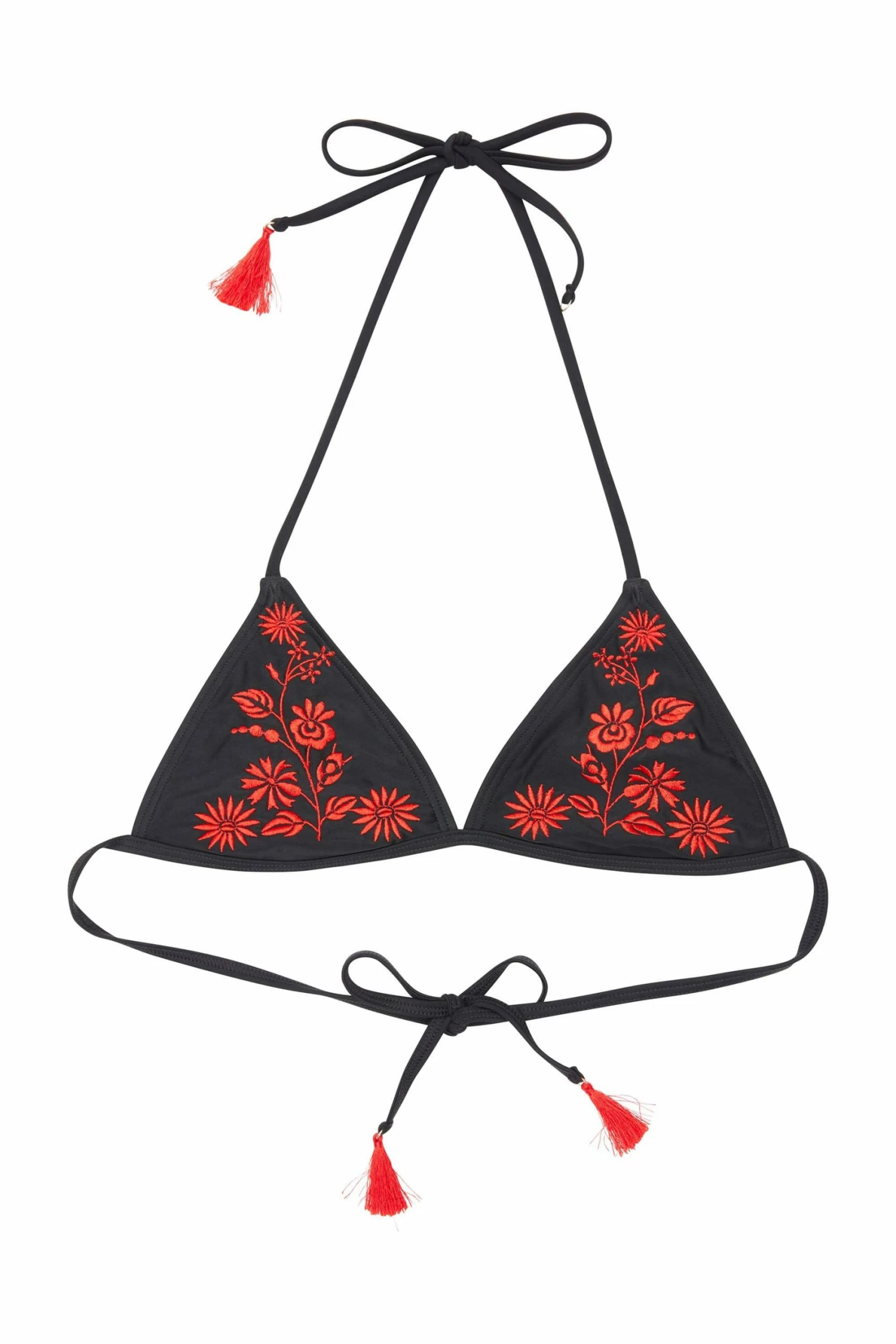 Bloom beachside in the Embroidered triangle Bikini, with its delicate red embroidery over black.