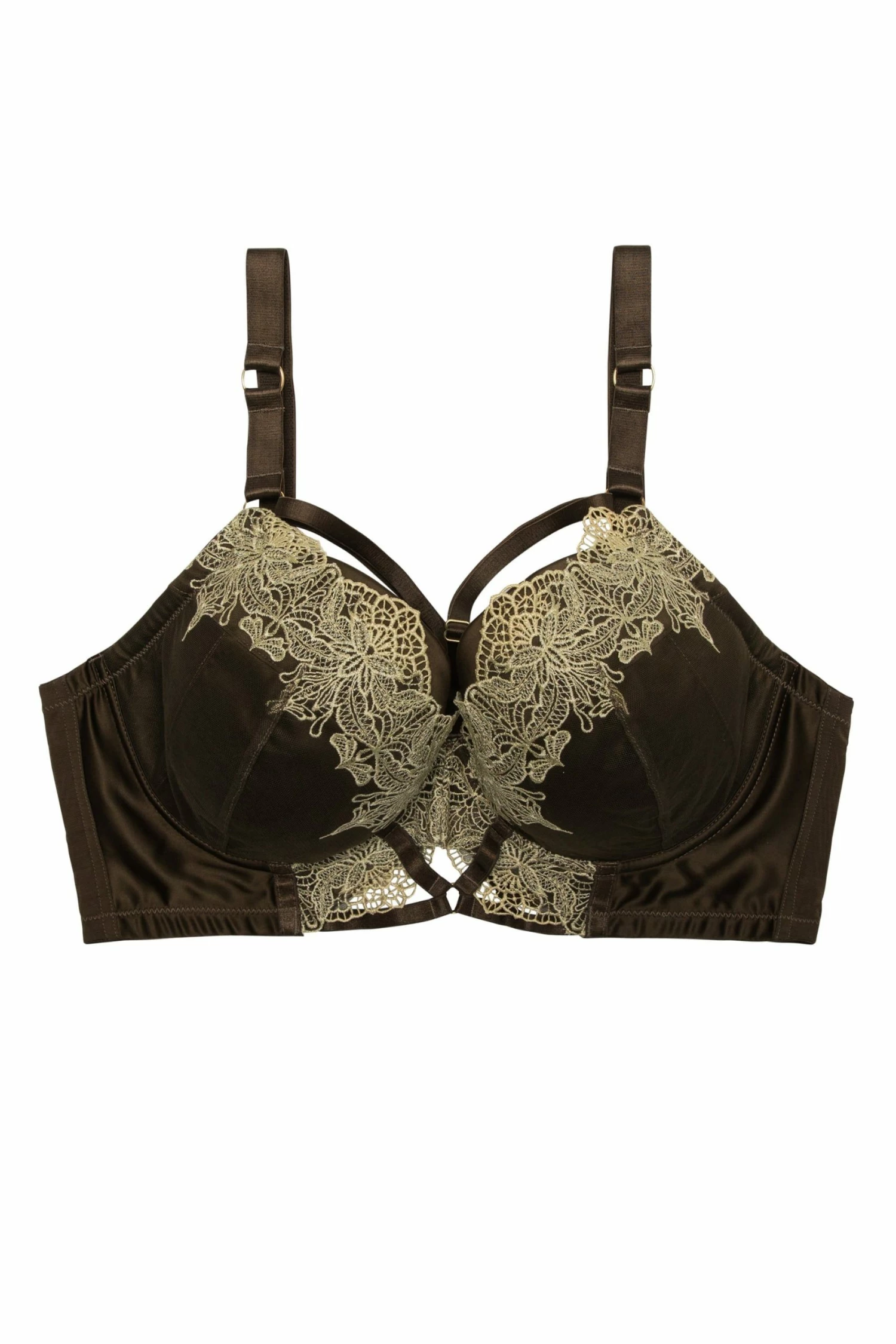 Seduce in this statement piece, Jari Bra combines lace, mesh and harness strapping to stunning effect. The yellow embroidered lace sits perfectly against the deep moss coloured satin, drawing the eye to the front of this bra. This set is perfect for adding a bit of spice to those special nights in.