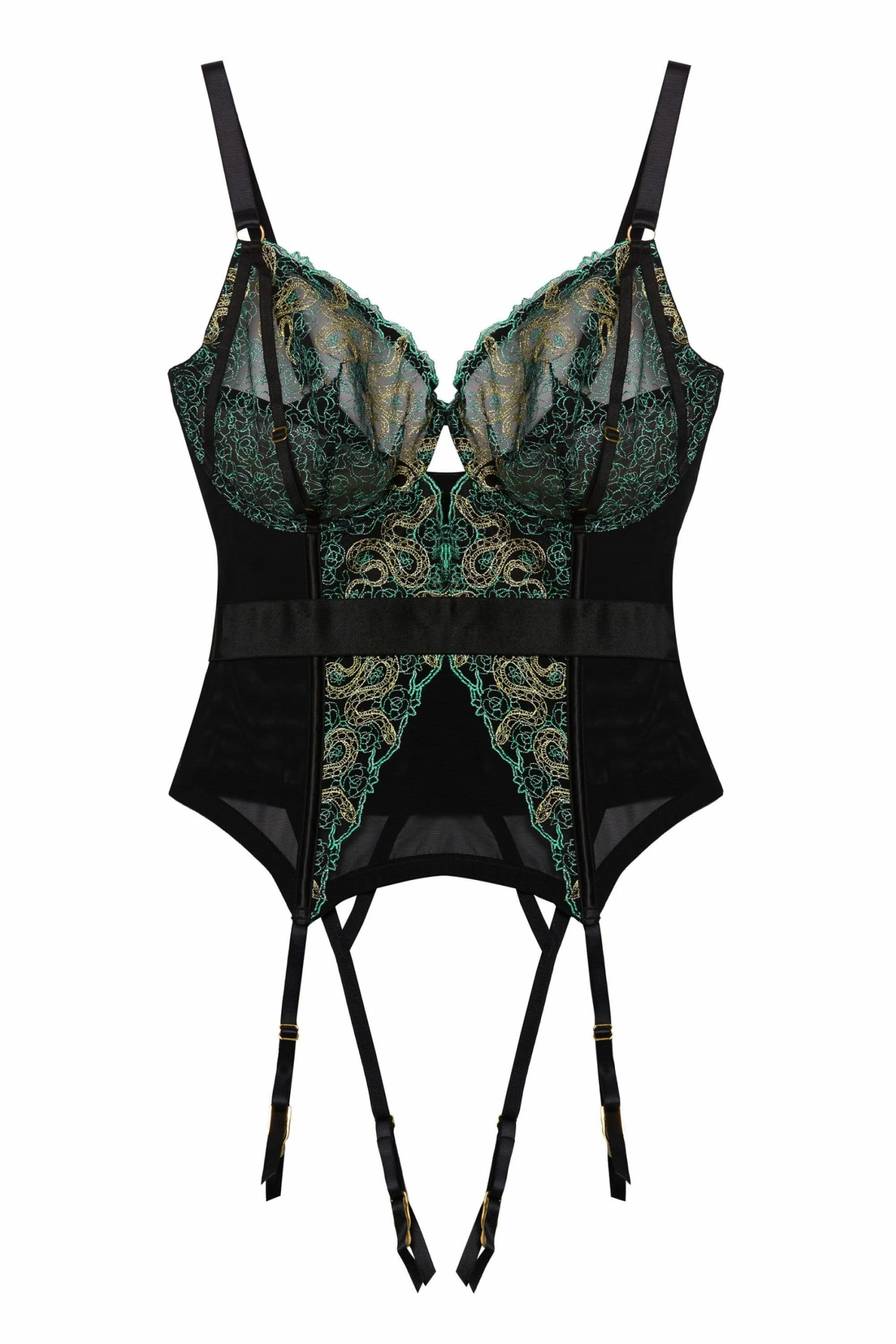 Venomous vamps, the Dakota set is for you. With it’s slithering snake embroidery over black mesh and glistening gold and green embroidered florals, this set is bound to tempt you into taking a bite of that deliciously sinful apple…
