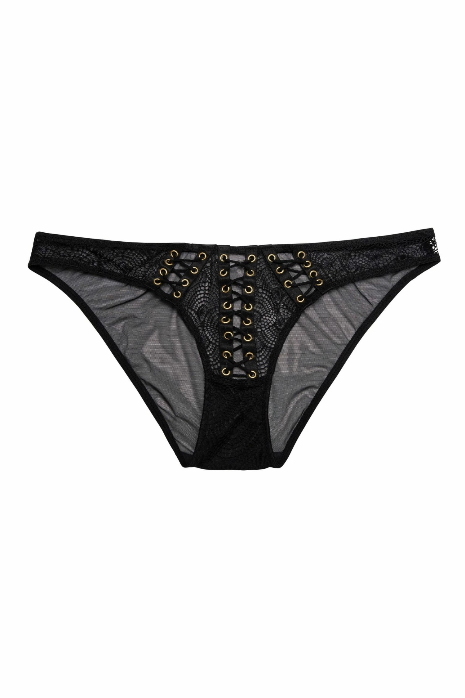 Lace-up your lingerie! The Florence set is for steamy nights. Geometric, circular lace is featured all over, which contrasts with the lace up detail on the front of the brief. The laces are made up from elastic string, perfect for getting your dream look.