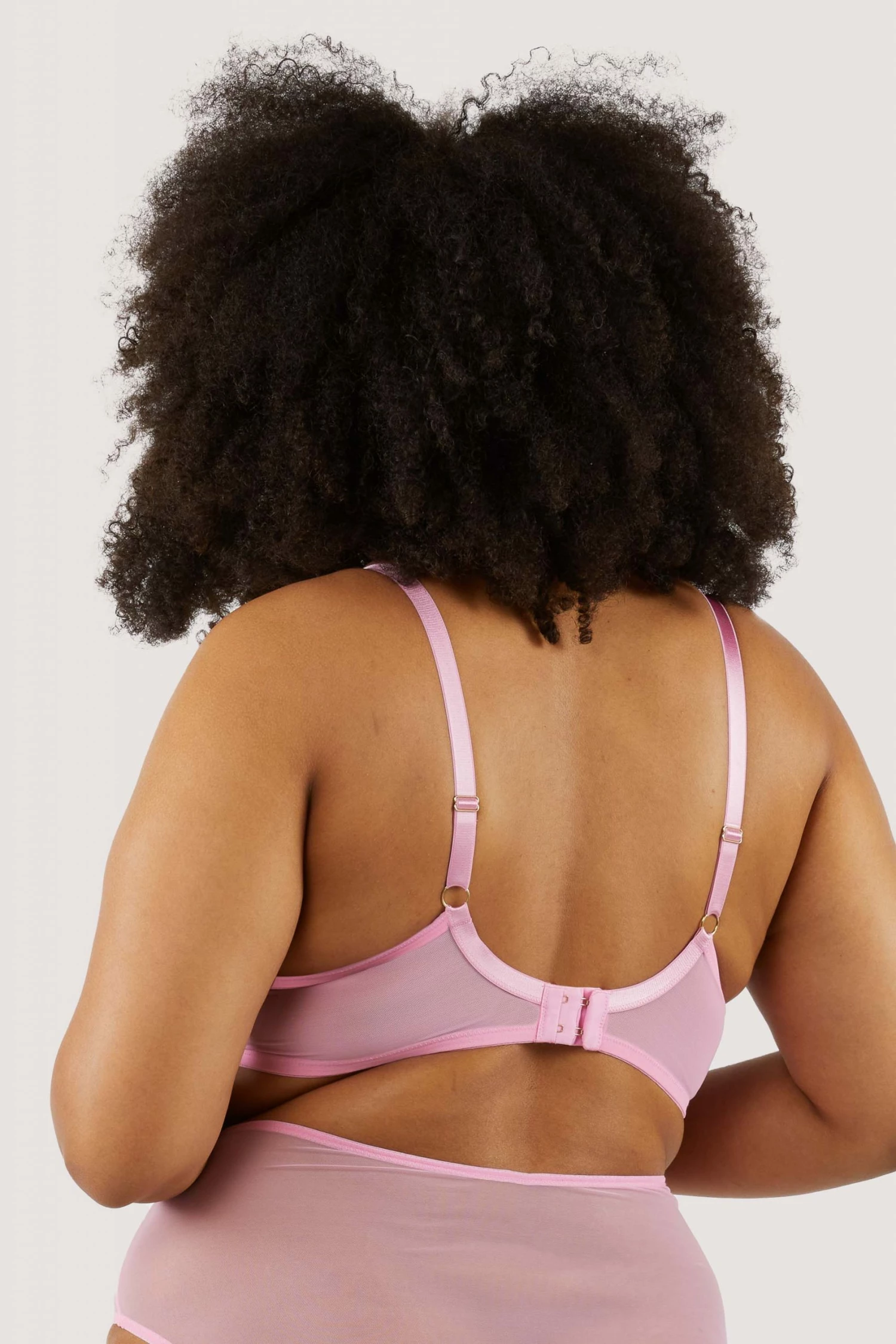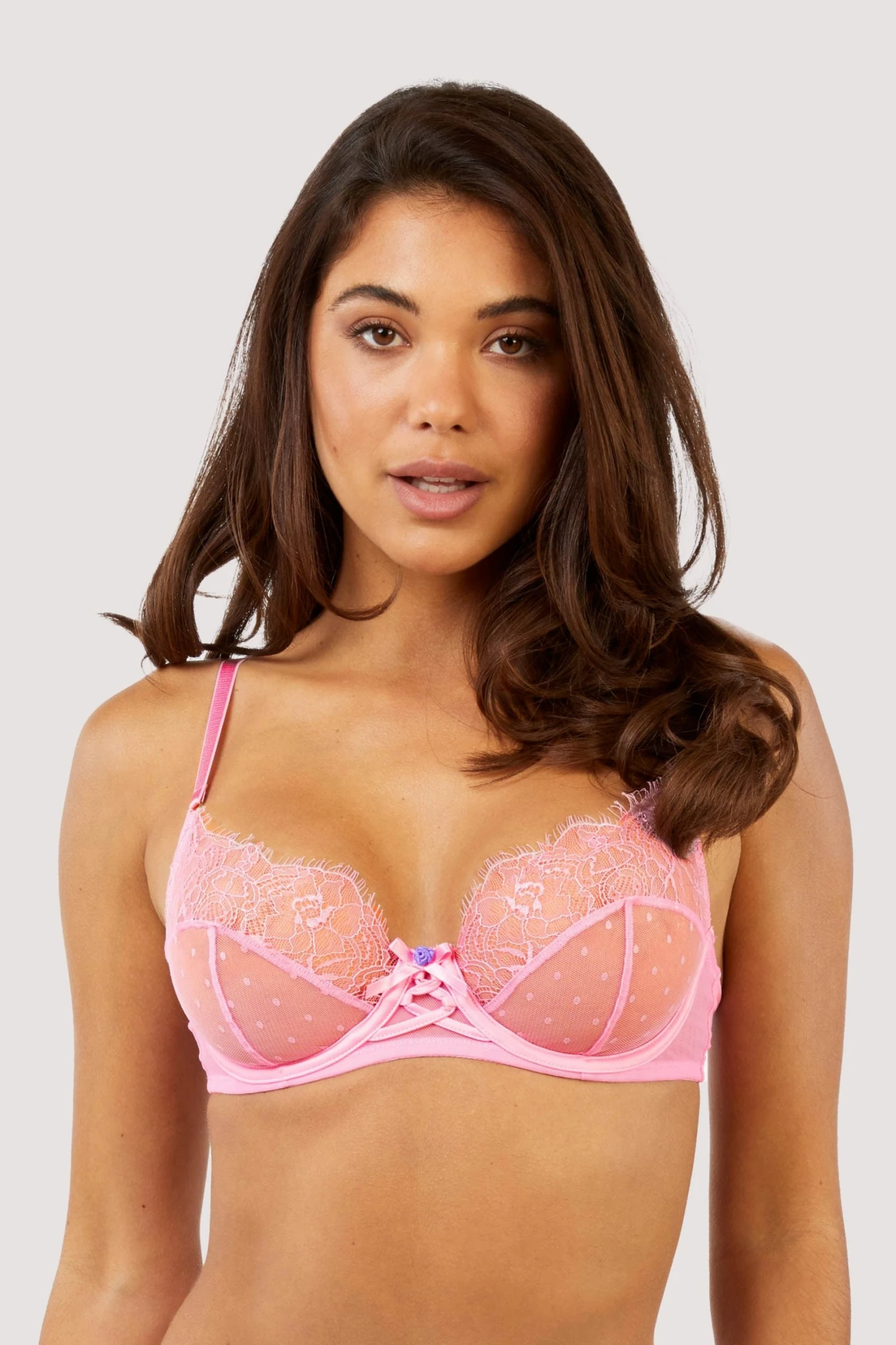 With her spotted mesh, lace edges and zig-zag bridge detailing, she makes herself known. She comes in a sweet candy pink colourway, and is finished with a satin pink and blue centre bow. She’s simply unmissable, a unique addition to your lingerie drawer…