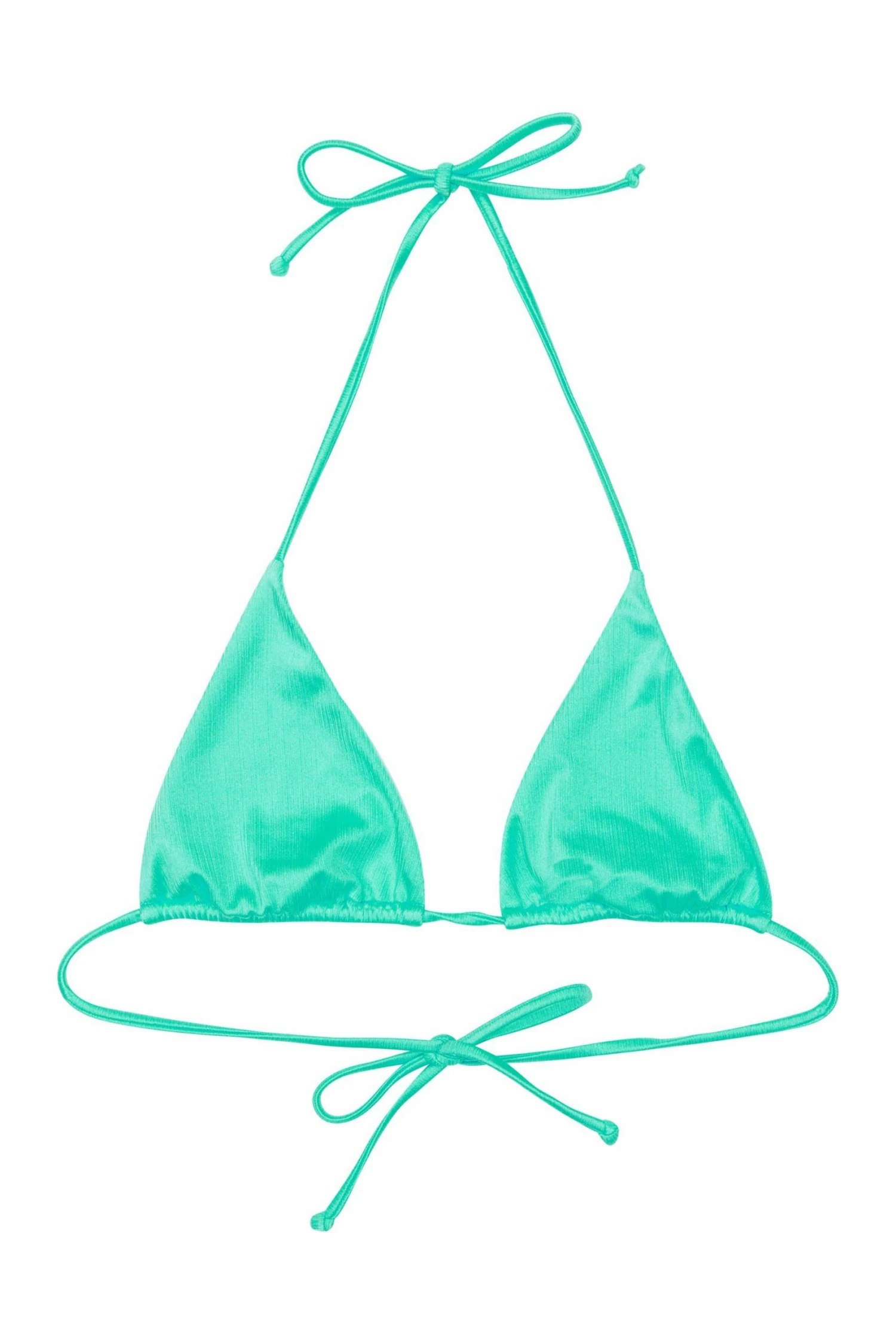 High shine, in our pearlescent mint green fabric. Soft to touch and perfect for Summer. In a simple triangle style, the cups are attached by a thin strap that ties at the back and in to a halter neck.