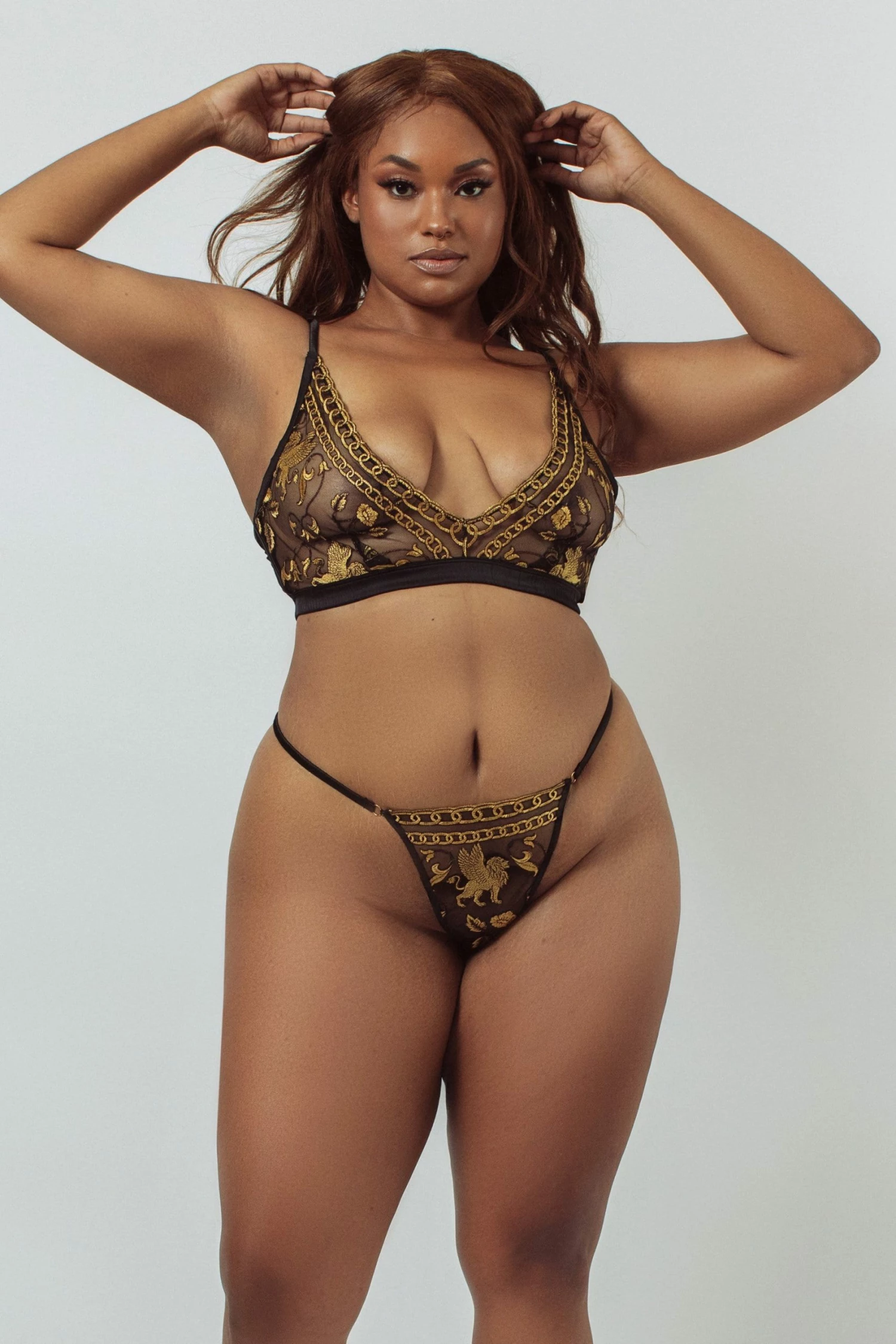 Gorgeous on its own or paired with the coordinating bralette & garter belt, this is a tiny panty with lots of detail. G-string at back and embroidery at front. Cotton lined gusset. Made with exclusive hand-rendered embroidery with lioness and chain details in black & gold.