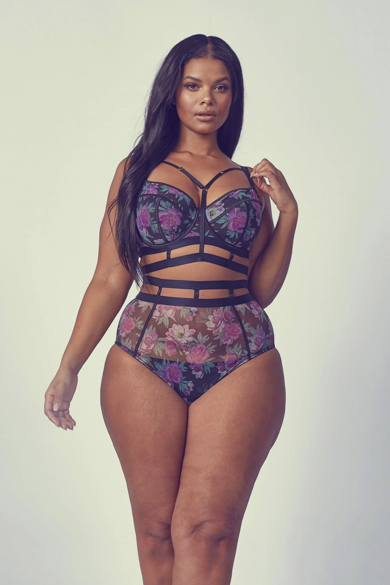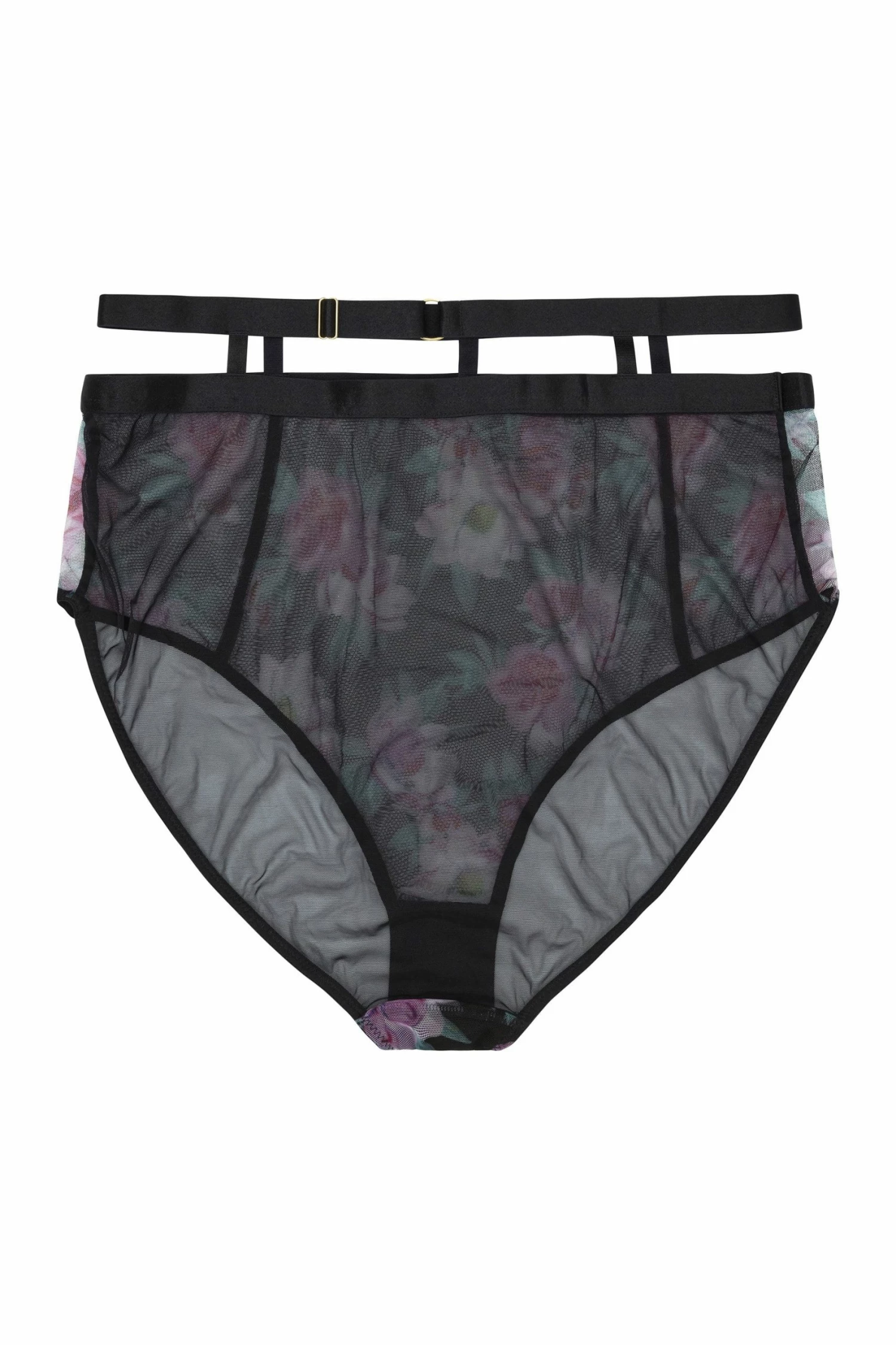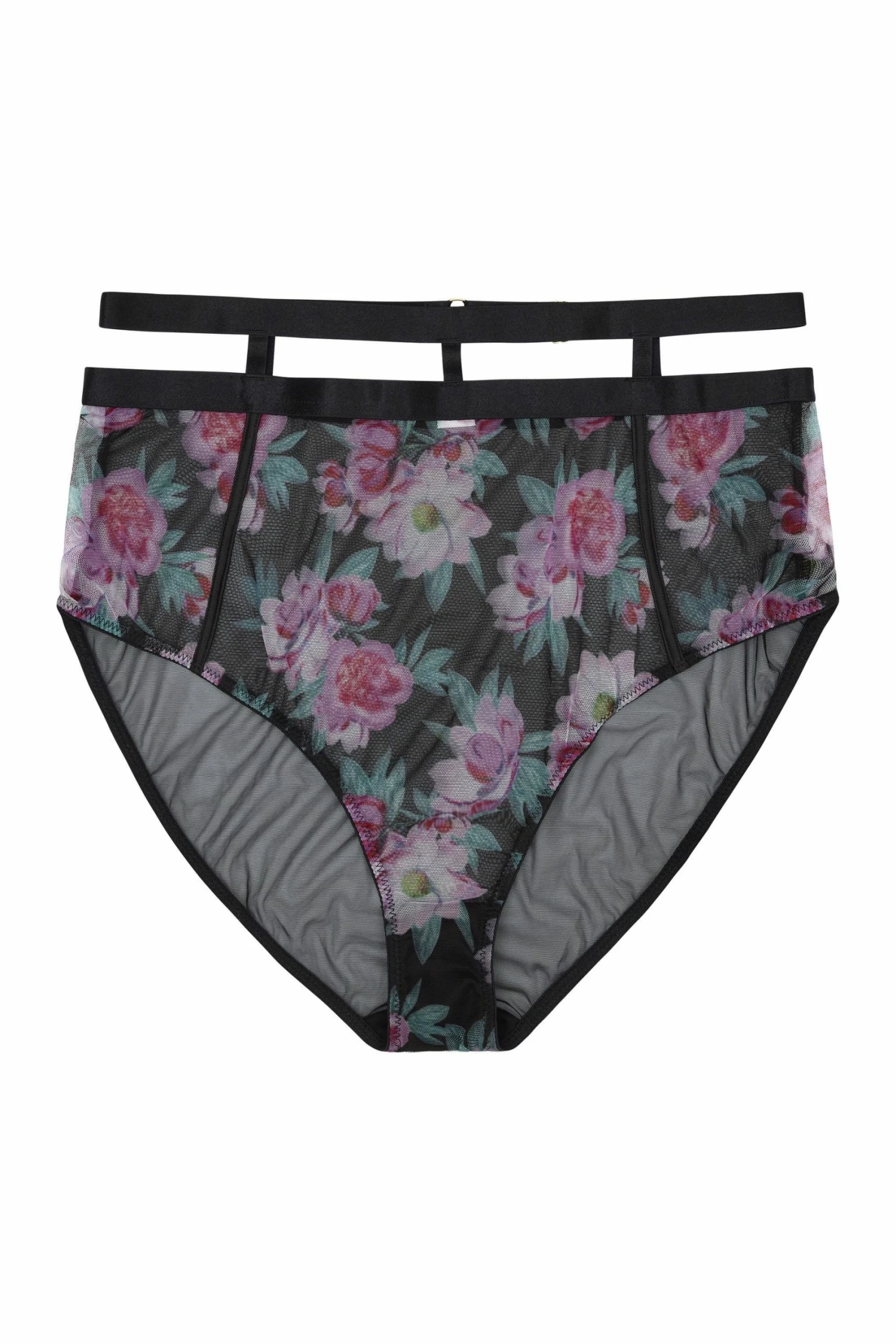 All caged up in Nemi. This floral number is edgy, fun and unique. Matching with the bra, this high waist brief features a thick black elasticated waistband detached from the mesh brief, to create a caged like cut out detailing. Featuring satin piping at the front to create panels, the back is fully sheer in black mesh.